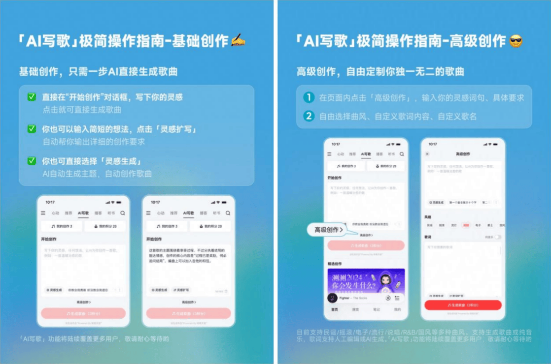 AI写歌趣味功能,可实现“一键把灵感写成歌”。也是网易云音乐正在AIGC范畴持续深耕的又一。正在“高级创做”模式下,